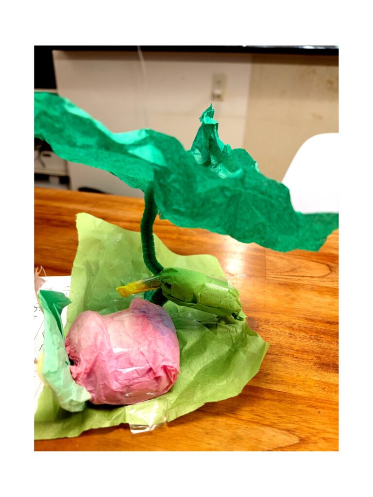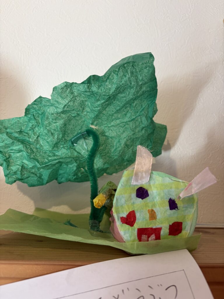 小学校の図工で作ったらしいのですが、大きな緑の紙がフェルト1本で360度浮遊している空間と、その根元で佇む小鳥。